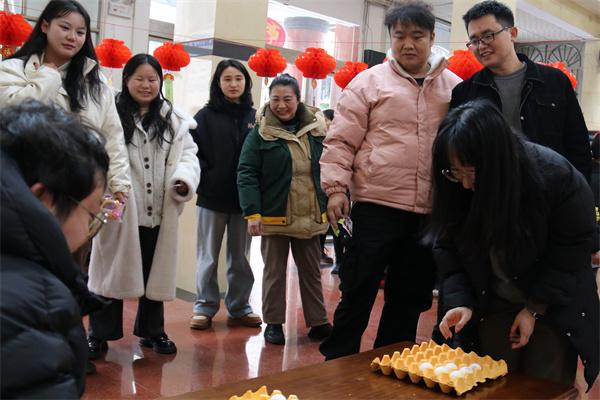 在一弹一跳中,元宵五子棋比赛拉开序幕。发球前,选手们拿着白色乒乓球,紧紧盯着由鸡蛋托制成的独特五子棋盘,眼神中透露出对这场别样较量的期待与专注。周围观赛的同事们也都沉浸其中,有的紧张地咬着嘴唇,有的兴奋地讨论着局势,待球落进“棋盘”,现场爆发出一阵热烈的掌声和欢呼声。
