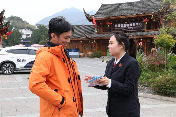 如果说上午是精神的“充电”,下午则是法治的“传递”——深入群众开展普法宣传活动。下午,检察干警带着宪法读本、普法手册奔赴芙蓉镇,以“即时解答+资料辅助”的形式开展普法宣传,在芙蓉镇景区三角坪、经开区芙蓉镇产业园等地方搭起“流动检察普法站”。