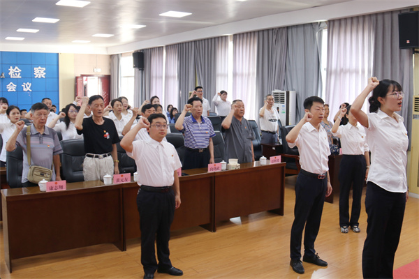 活动在雄壮激昂的《中华人民共和国国歌》声中拉开序幕,全体检察人员整齐肃立,高亢的歌声在会场回荡,激荡着每个人的爱国情怀。随后,在青年党员代表吴凤娇同志的领誓下,全体与会党员面对鲜红的党旗,紧握右拳,庄严地重温了入党誓词,誓言铿锵有力,彰显了党员们的坚定信念和崇高追求。