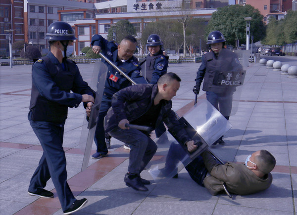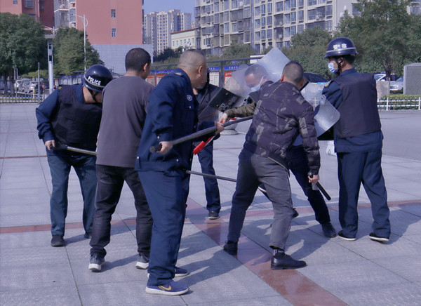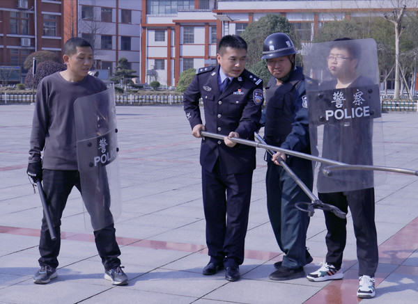 活动中,公安局治安大队大队长袁烩焕向演练人员讲解、示范了反恐防暴基本技能。随后,一名手持“利刃”的蒙面“暴徒”冲进校园,老师和保安组成的反恐防暴应急处置小组持防护器械反应迅速,使用器械与“暴徒”展开周旋,最终将其制服。