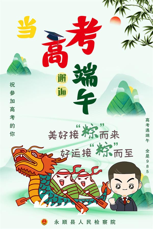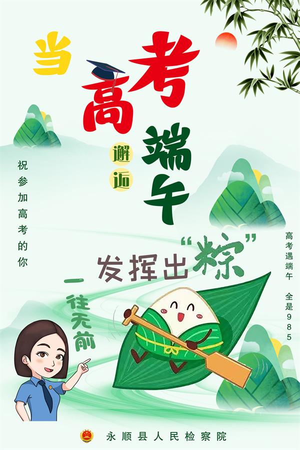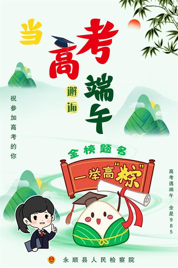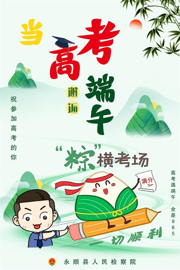 ”上,传统节日的美好祈愿似乎又多了一层意义。永顺检察借此祈愿,祝愿考生们金榜题名、一举高“粽”,学霸附体、好运接“粽”而至!